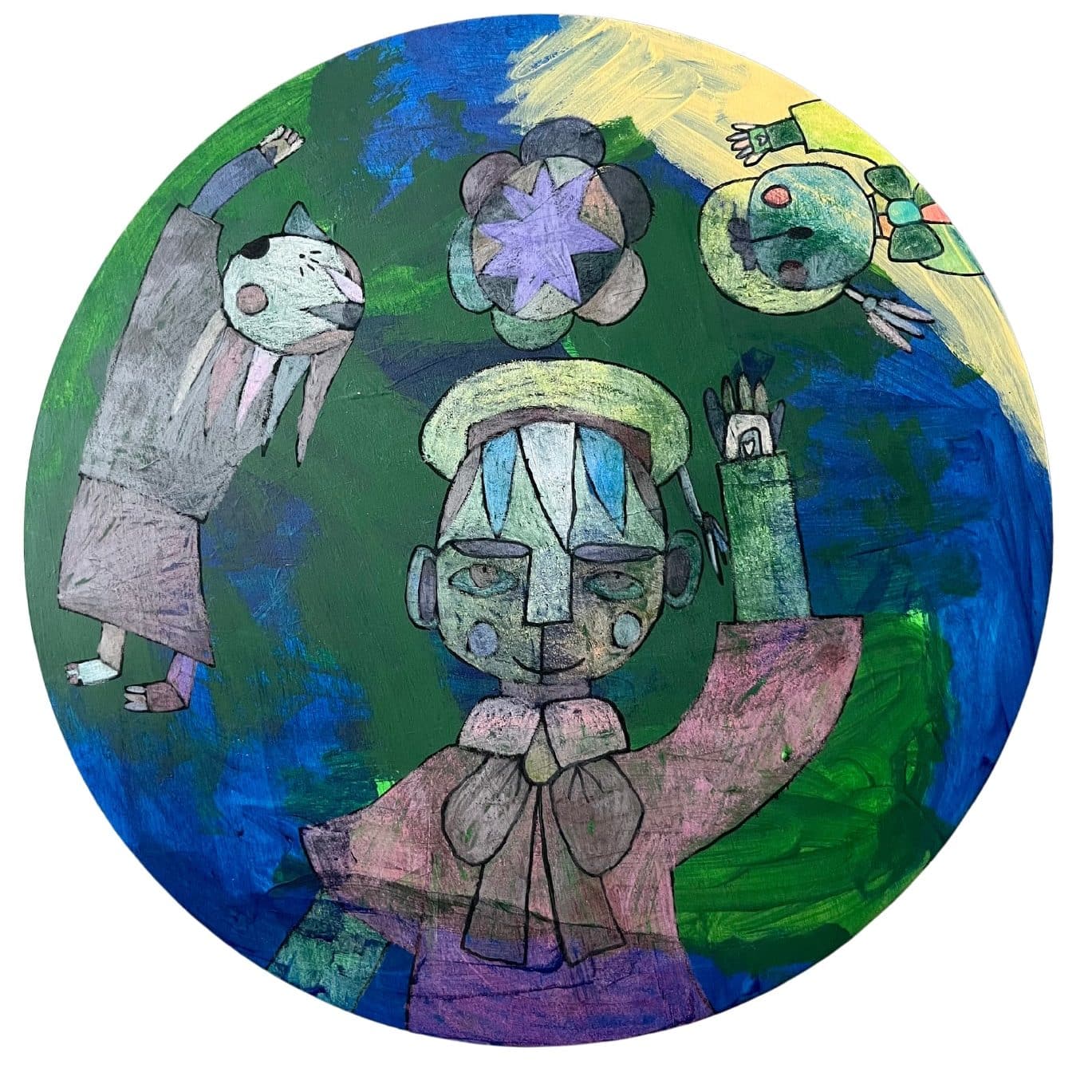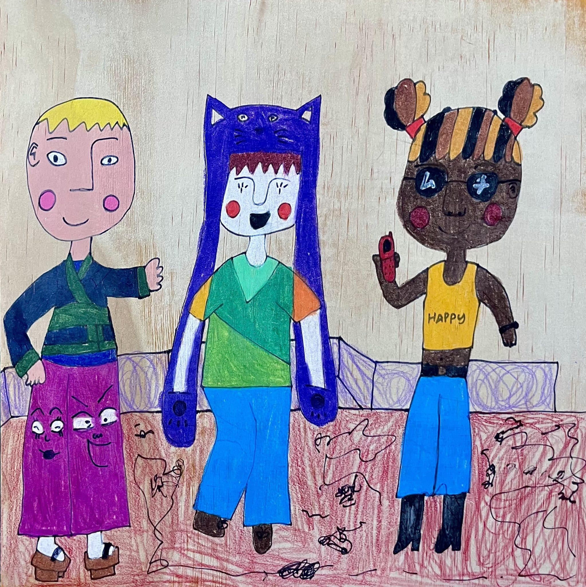 Acrylic paint and crayon on wood